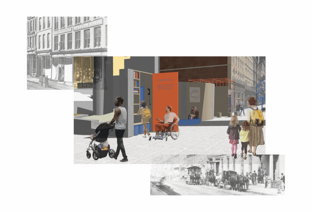 The installation, represented in Figure 4, nicknamed ‘Show and Tell,’ was designed to respond to this layered context by opening up space for public contribution and reinterpretation. The principles prioritized here include fragments of history, to highlight what has been erased or preserved selectively; playful forms, to contrast the site’s hard urban character and attract new users; moments of discovery, to slow down the experience and draw attention to overlooked narratives; and open-ended components, to question the idea of permanence and allow for future additions. These strategies were chosen to challenge Granville’s fixed, polished image and instead support intergenerational engagement through interactive storytelling, object sharing, and shared use of adaptable infrastructure, as revealed in Figure 5, that weaves the site’s history into its existing context.