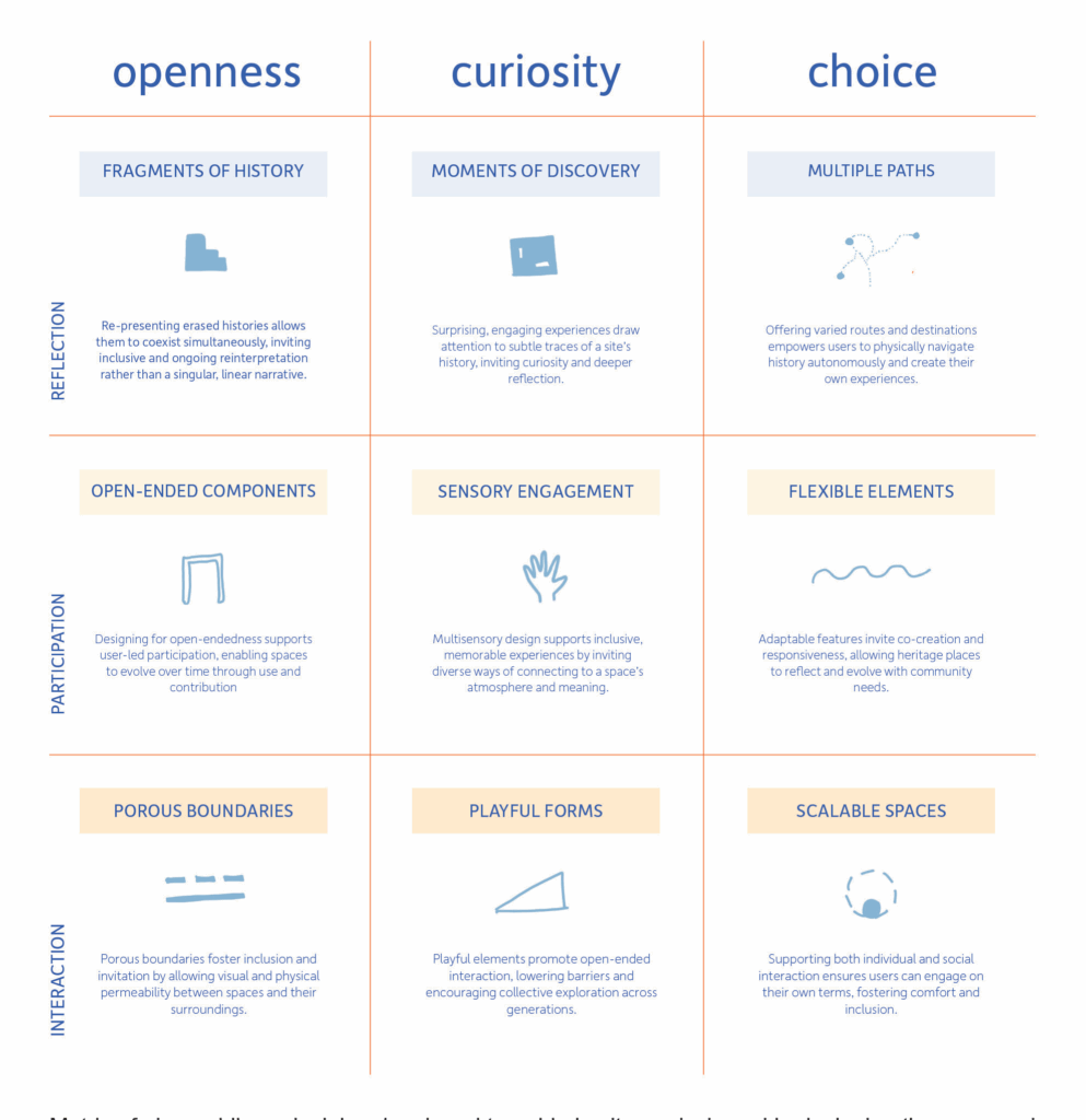 The translation of care into space can be done by focusing on three core themes: openness, curiosity, and choice. As shown in Figure 2, these qualities intersect with reflection, participation, and interaction to form a matrix. Together they suggest that caring for heritage is not a fixed act, but an ongoing negotiation between people, materials, and time.