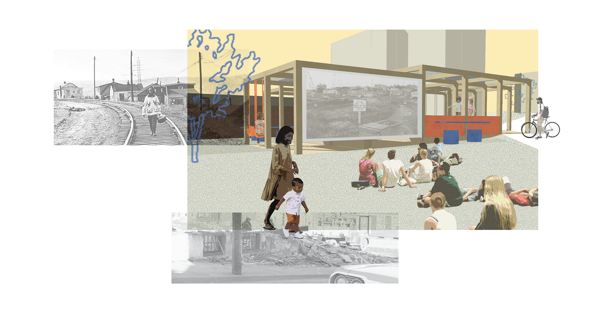 Nicknamed ‘Room for Everyone,’ the installation is rooted in the idea of home, not only the ones that were taken, but the one that has been rebuilt since. Figure 8 illustrates how it prioritizes fragments of history, to acknowledge what remains and what has been forgotten; open-ended components, to allow future use to evolve with the needs of the community; scalable spaces, to support both large gatherings and quiet, individual use; flexible elements, to let the site shift between homework, eating, playing, or sharing; and porous boundaries, to prioritize safety and ensure visibility and connection between the park, homes, and street.
