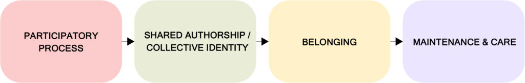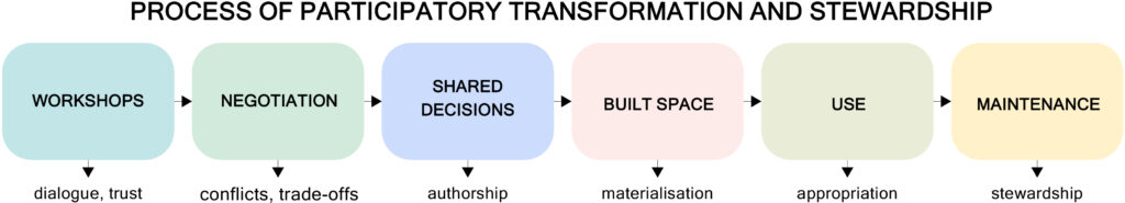 Belonging thus began before construction. The workshops produced relational bonds that later stabilised the physical transformation. The process, from initial workshops to long-term use and maintenance, can be understood as a continuous sequence linking participation to stewardship (Figure 2).