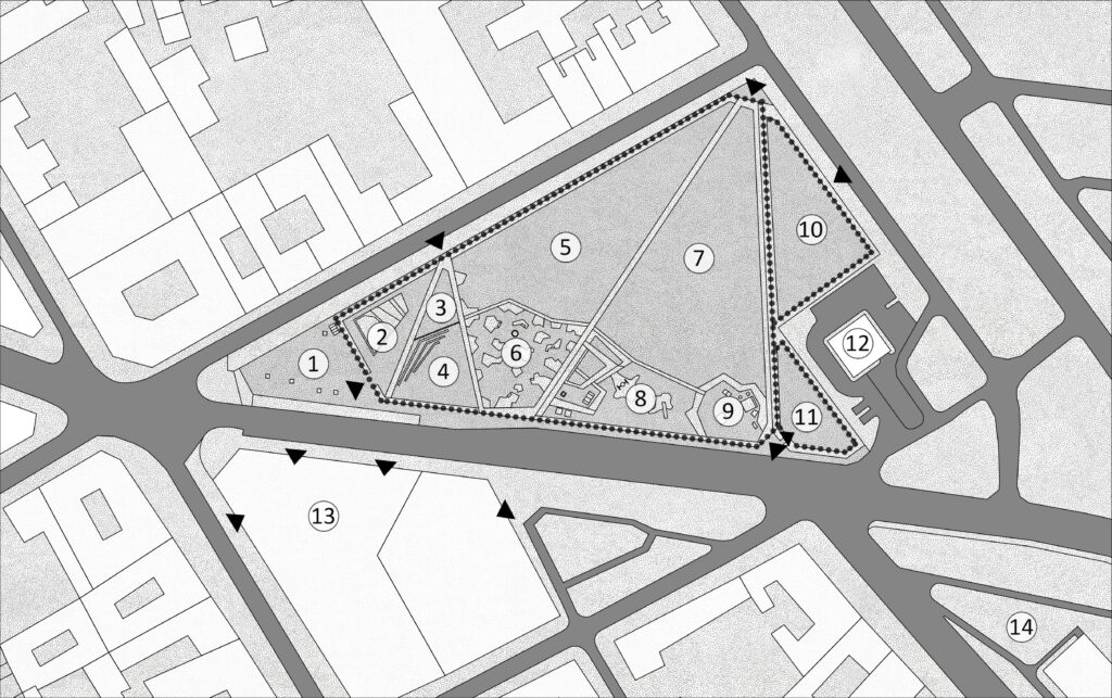 The spatial organisation of Teleki Square reflects negotiated pluralism rather than fragmentation. The park integrates an entrance square and event space, an information area, a children’s play garden, a teenage corner, shaded seating with chess tables, and separate dog areas.¹⁴ Fig. 3 shows the plan of Teleki Square with separate areas marked on it.