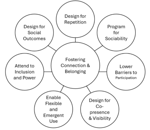 To understand leisure as a generative layer of social infrastructure, we must design for social connection beyond providing space (see Figure 1). Doing so calls for an intentional focus on the conditions that support repeated interaction, shared activity, and the gradual emergence of belonging. The following principles offer a starting point for planners and urban designers who seek to integrate leisure into conscious city design: