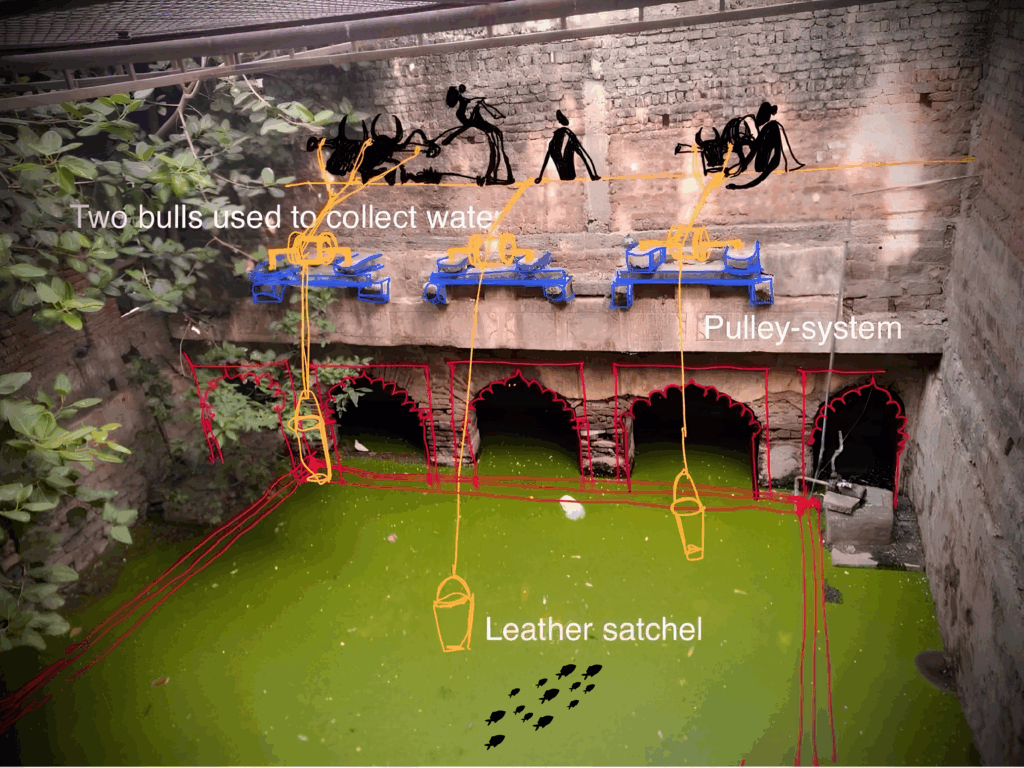 Thus, reciprocity is not abstract morality. It is infrastructural discipline. Where modern systems hide extraction through private borewells and centralized supply, reciprocity becomes harder to sustain because dependence becomes less visible. The mechanical reciprocity of the stepwell was facilitated by an intelligent pulley system, which is depicted in Figure 3. Furthermore, the architectural complexity and depth of the subterranean structure are visible in the plan of the baoli in Figure 4. If spatial arrangements structured forms of belonging, temporal rhythms determined how these relationships were sustained across seasons.