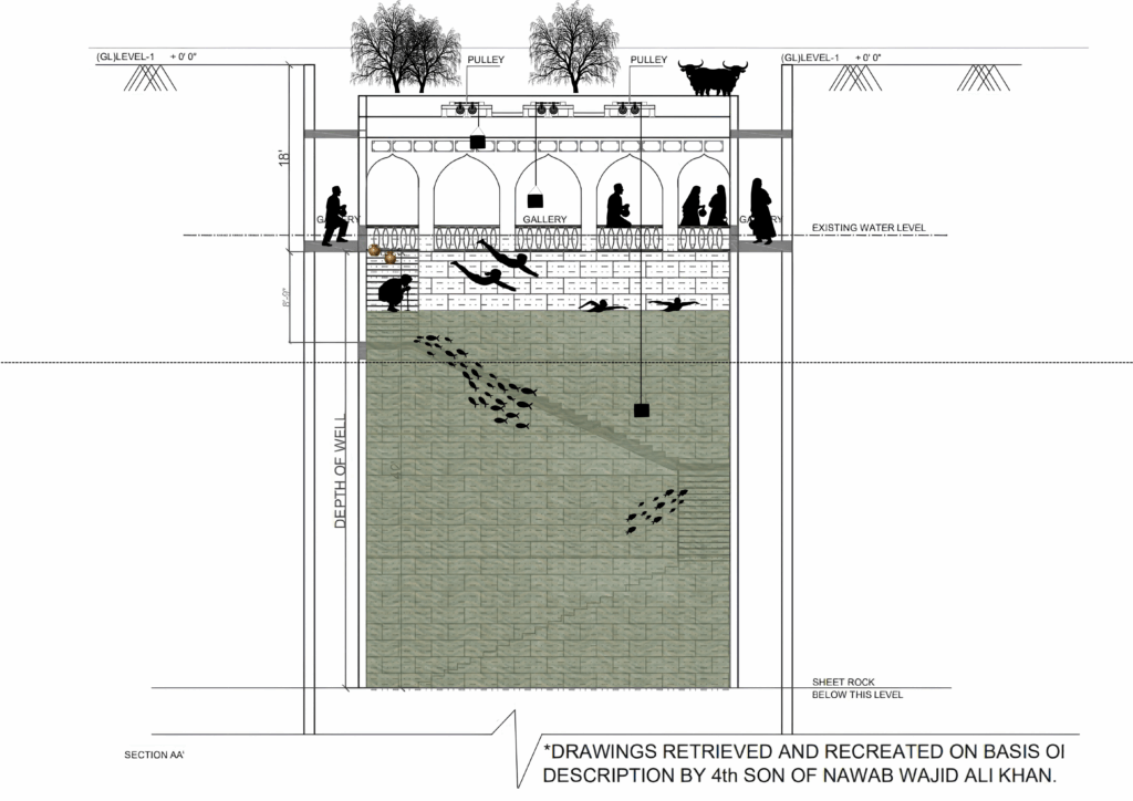 Shifting light across stone surfaces trained attention to diurnal movement. These experiences created a bodily literacy of environmental modulation: temperature, humidity, shade, sound, and stillness became ways of knowing. The architectural and hydraulic memory of K.W. Bagh has been preserved largely through the oral histories and technical recollections of the family. The intricate details of the baoli’s subterranean galleries and the mechanical precision of its leather-satchel pulley system were vividly mapped through the descriptions of Engr Ameer Ali Khan (affectionately known as Shazaad Mama), the fourth son of Nawab Wajid Ali Khan. His engineering perspective ensured that the baoli is remembered today not just as a nostalgic childhood retreat, but as a masterpiece of vernacular hydro-social engineering.