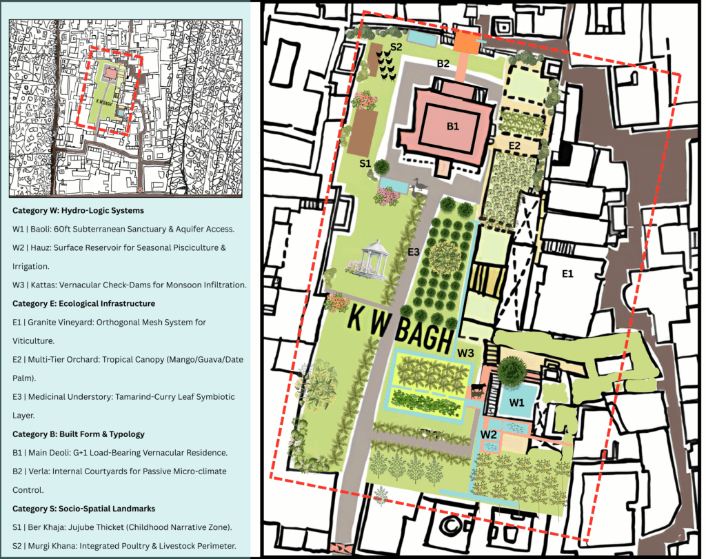 Most importantly, K.W. Bagh functioned as a network rather than a set of isolated features. Baoli water supported irrigation; orchard canopy stabilized microclimate; the house amplified airflow; kattas supported recharge; hauz tanks balanced distribution. Climate, architecture, labour, play, and water governance formed a continuous relational system.