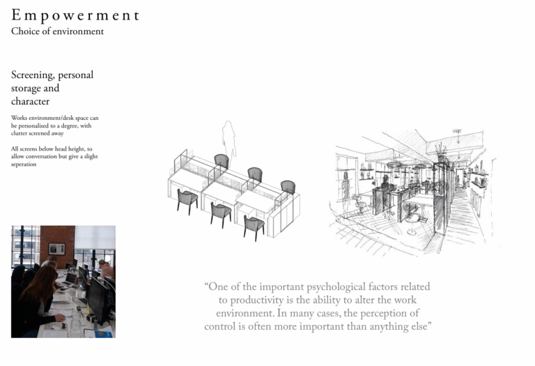 Proxemics and human scale details – Careful configuration of desk screens (widths and heights) in relation to zones of personal space, to enable users to feel they have a territory of their own, whilst maintaining social interaction and the ability to have a conversation and eye contact with their co-workers.