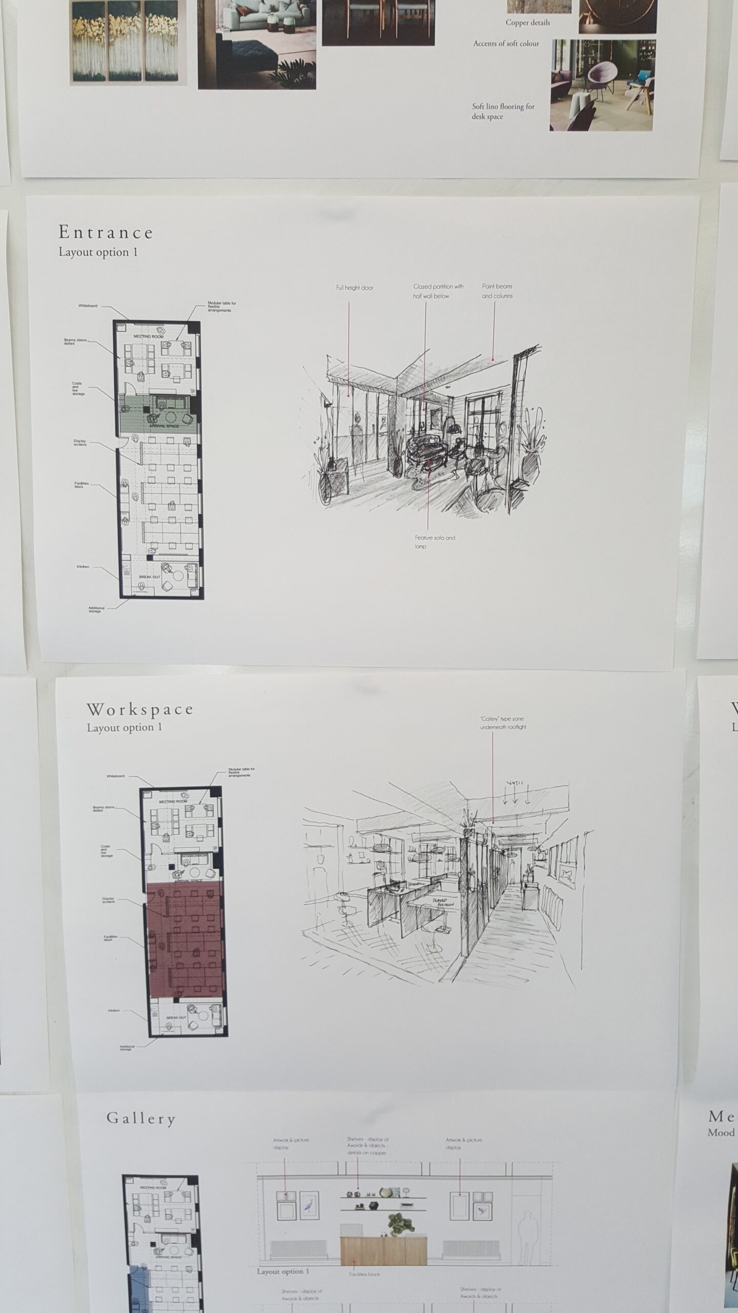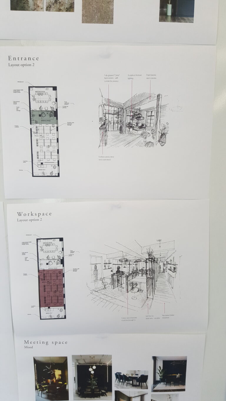 Designs were presented and options explored directly with the founder and her core team, who could then discuss them with the wider team to get more feedback. Plans, visuals and presentation materials were put up in the office space as the team started to work there, and as the team quickly grew over time the design evolved as well.