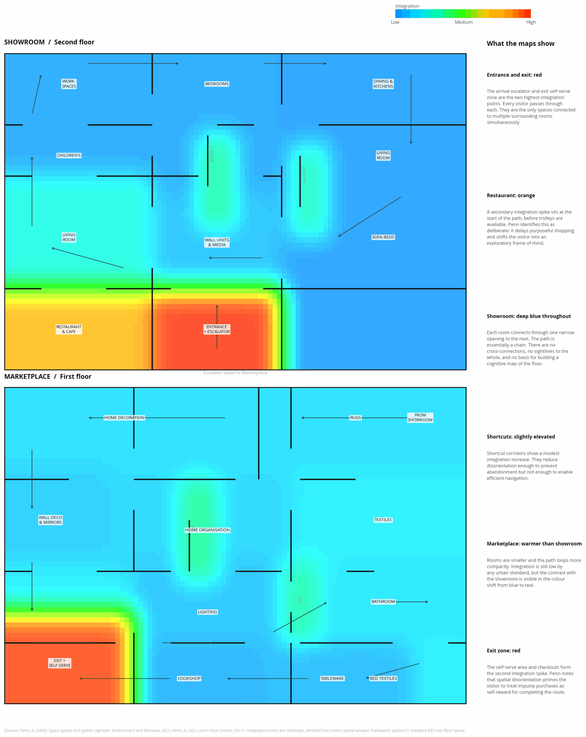 Penn’s 2003 paper contributes to this analysis of theoretical precision. IKEA is not simply a confusing shop. It is a spatial environment engineered to suppress topological map formation, to prevent the cognitive process that Penn identifies as the foundation of natural movement, and to redirect the visual attention that would normally support navigation towards the products that line every wall of the route. The spatial logic that, in a well-configured city or building, generates social life, chance encounter, and confident use of space is here inverted to generate a specific commercial outcome.