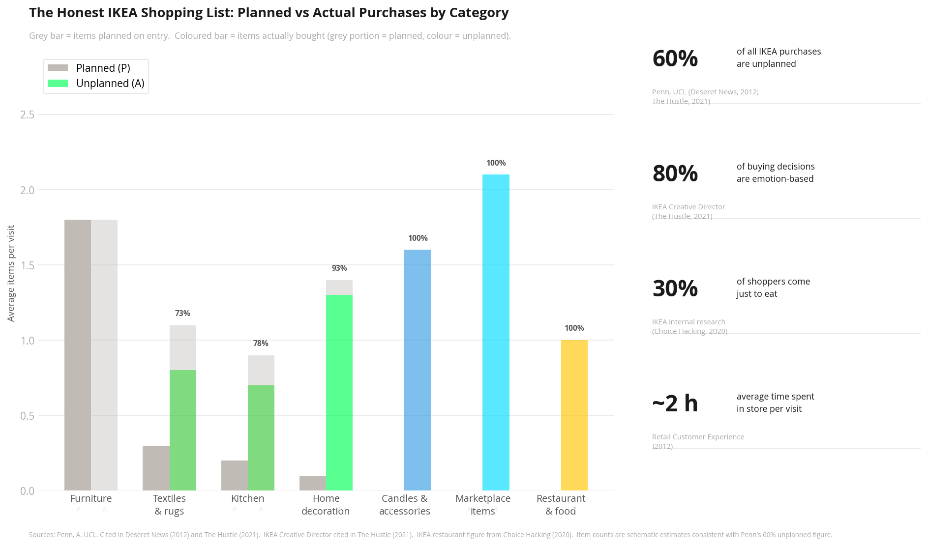 Grey bar shows items planned on entry (P); coloured bar shows items actually bought, with the grey portion representing the planned fraction and the colour representing unplanned additions (A). Percentage labels indicate the unplanned share of each category’s actual total. Figures are schematic estimates consistent with Penn’s 60% unplanned purchase rate (UCL, cited in Deseret News, 2012).